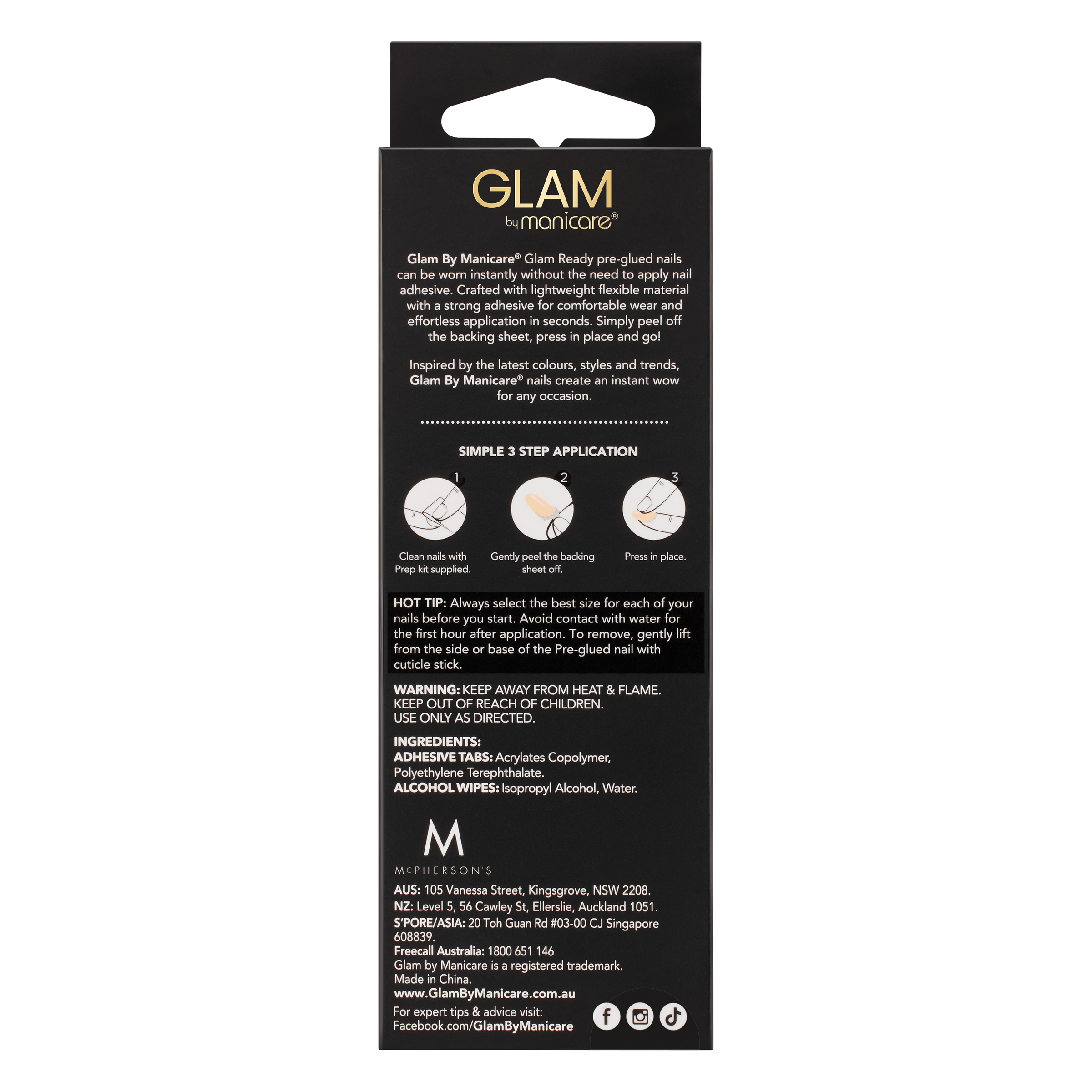 Glam By Manicare® Glam Ready pre-glued nails can be worn instantly without the need to apply nail adhesive.