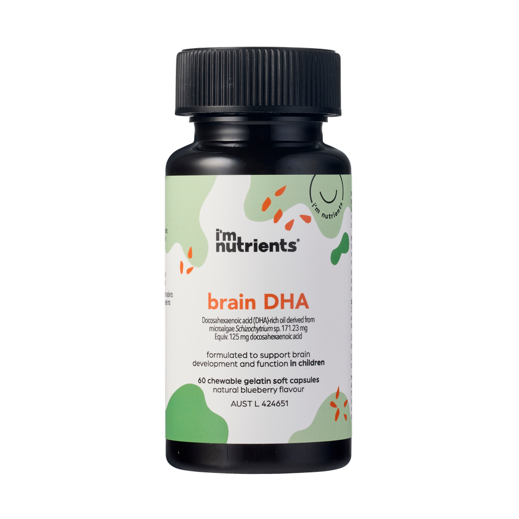 Brain DHA contains  docosahexaenoic acid (DHA), sustainably sourced from microalgae Schizochytrium sp. to support brain/central nervous system development and brain function in children.