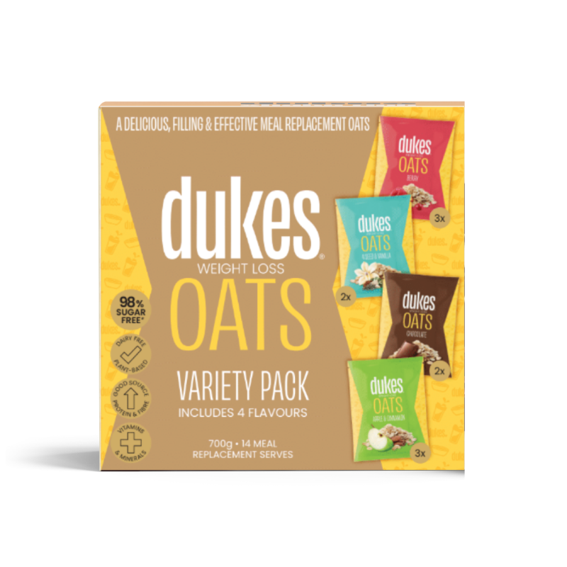Dukes® Weight Loss Oats Variety 10 Pack is a nutritionally complete, dairy-free meal replacement that brings comfort, convenience, and results to your weight loss journey. Made with a blend of protein, fibre, and essential vitamins and minerals, these oats are designed to keep you fuller for longer while curbing cravings and supporting effective weight management.