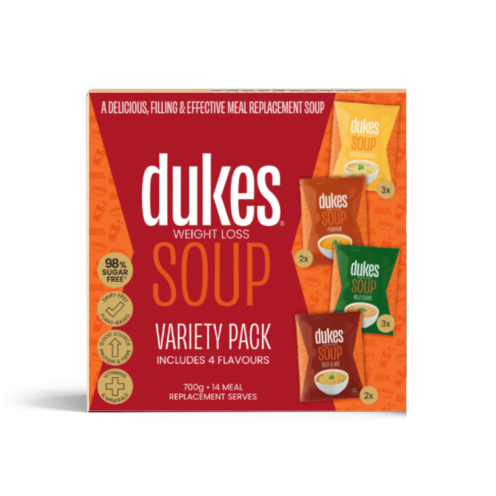 Dukes® Weight Loss Soup Variety 10 Pack is a nutritionally complete, dairy-free meal replacement option designed to support healthy weight management with savoury flavour and warming comfort. Each soup is enriched with a high-quality protein blend, fibre, essential vitamins, and minerals to keep you feeling full, reduce cravings, and help drive effective weight loss.