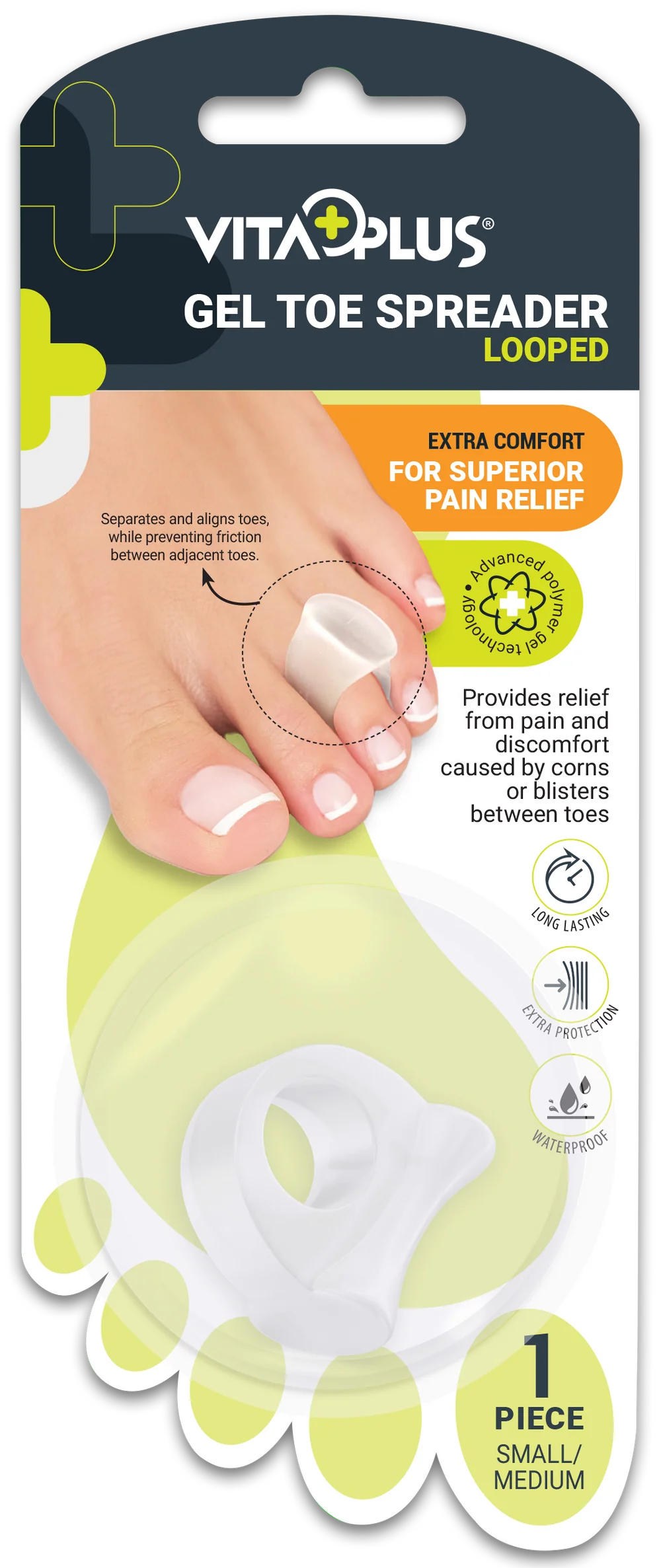 The VitaPlus Gel Toe Spreader Looped is designed to provide effective relief from toe friction, overlapping toes, and pressure-related discomfort.