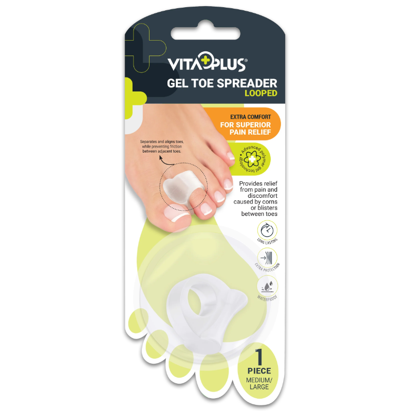 The VitaPlus Gel Toe Spreader Looped is designed to provide effective relief from toe friction, overlapping toes, and pressure-related discomfort.