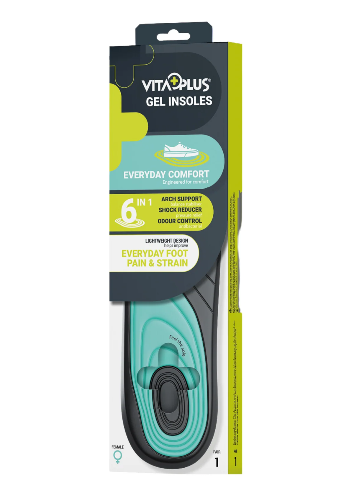 The VitaPlus Everyday Comfort Gel Insole is designed to provide superior support, cushioning, and freshness for all-day wear.