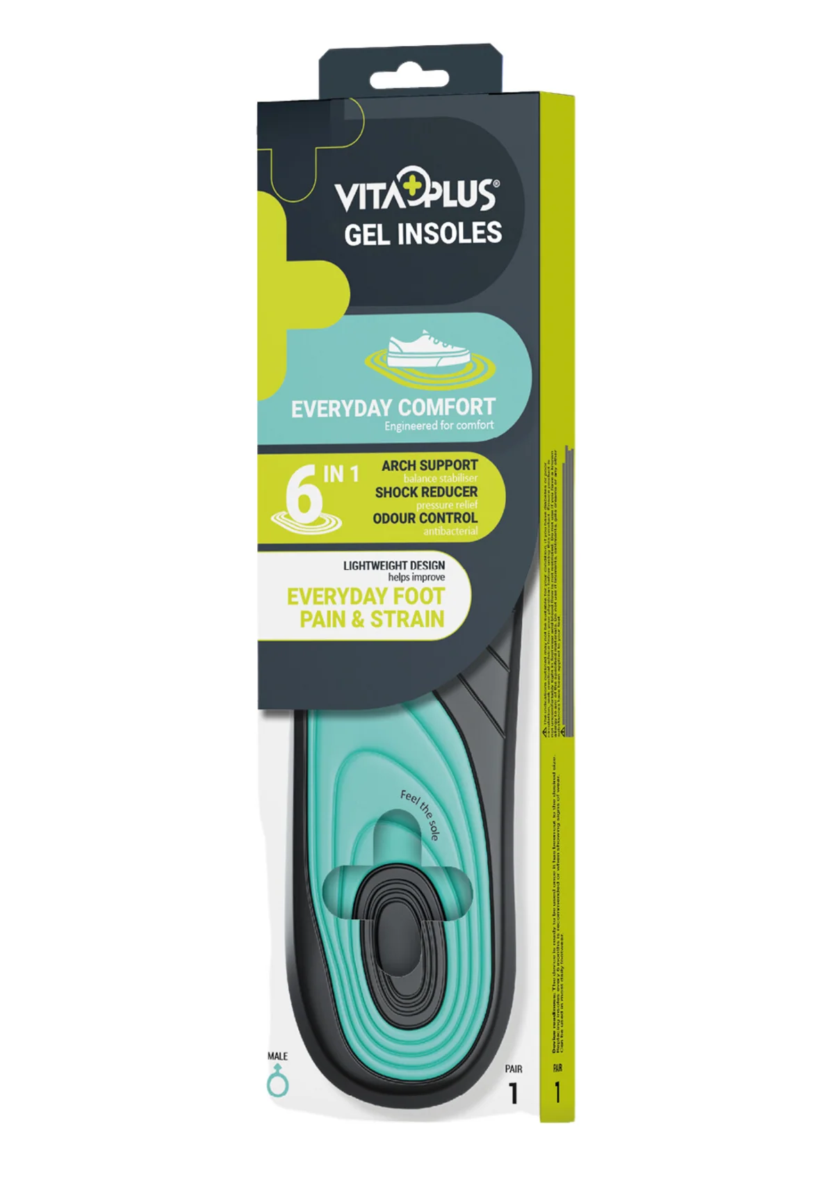 The VitaPlus Everyday Comfort Gel Insole is designed to provide superior support, cushioning, and freshness for all-day wear.